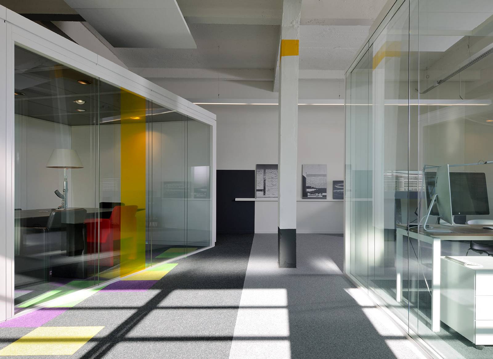 Le design intérieur se distingue par son agencement en bureaux "boîtes vitrées". Cette configuration permet de bénéficier d'une lumière naturelle omniprésente, sublimant l'architecture unique du lieu. Le style contemporain s'intègre harmonieusement dans cet édifice ancien chargé d'histoire, créant un contraste saisissant et élégant.