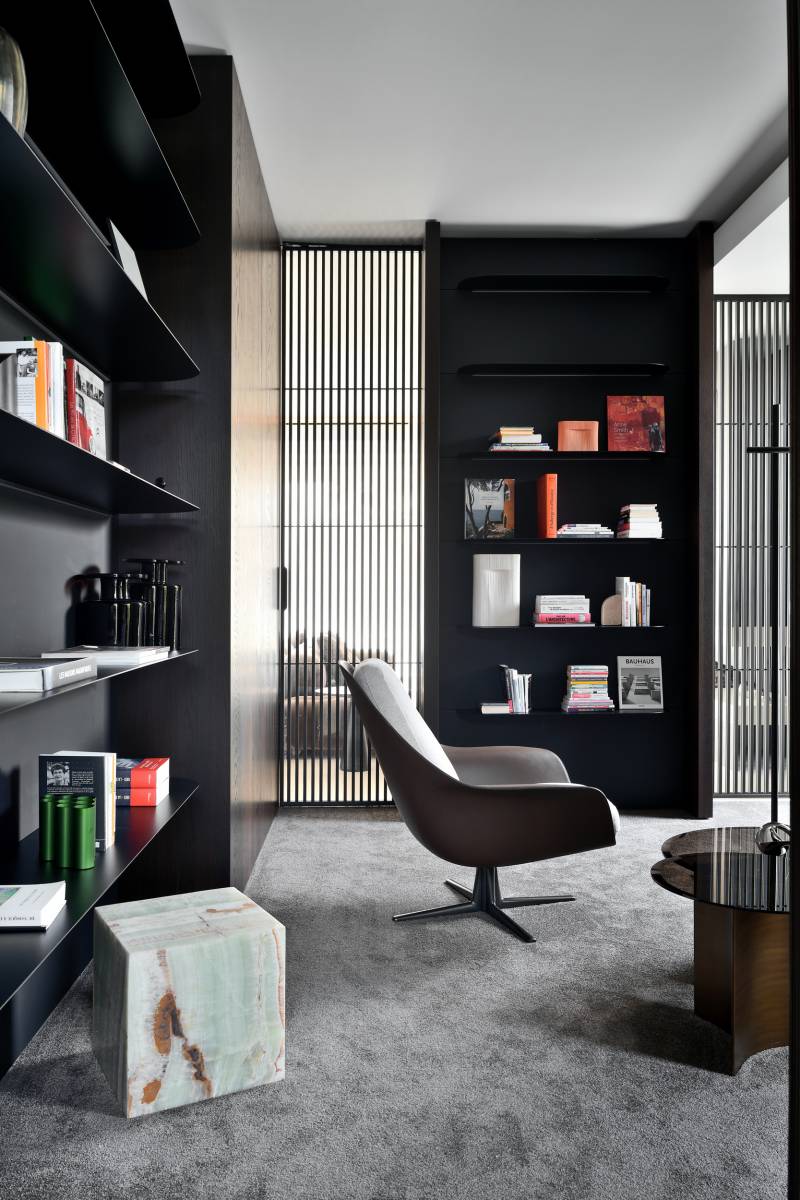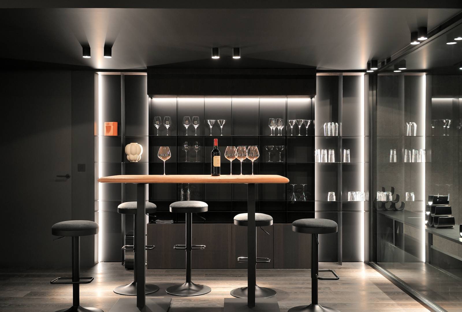 Les matériaux naturels sont à l’honneur : chêne, noyer, métal et pierre habillent les murs, sols et mobiliers sur mesure. Cette palette authentique crée une atmosphère chaleureuse et intemporelle, où la texture de chaque surface dialogue avec la lumière. La lumière, véritable protagoniste du projet, sculpte les espaces et met en valeur les détails architecturaux. Un savant jeu de lumières indirectes, de suspensions graphiques et de spots intégrés confère à chaque pièce une ambiance unique et évolutive au fil de la journée.