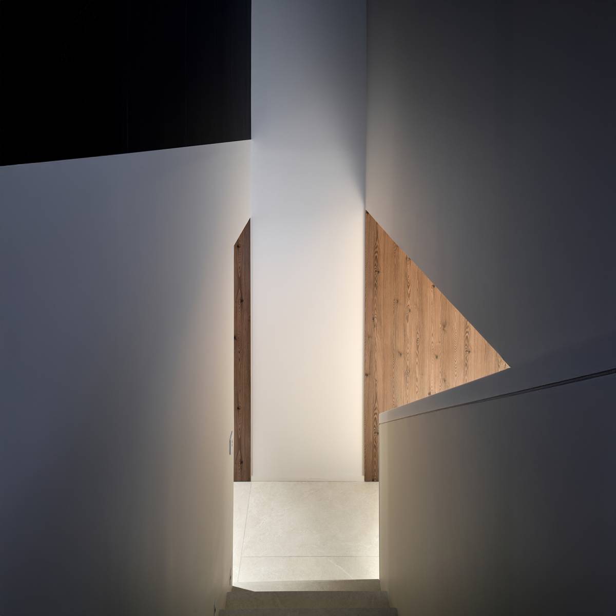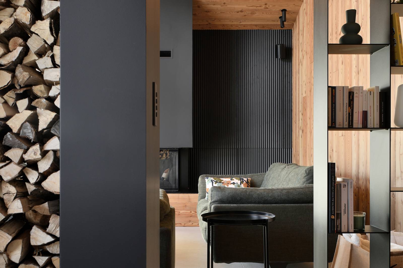 L’architecture intérieure agit comme une extension de la structure : les parois boisées soulignent les lignes contemporaines, les cheminées et alcôves sculptent les volumes, et le mobilier intégré s’aligne avec les ouvertures pour inviter le regard vers la montagne. Les jeux de lumière, entre éclairage indirect et projecteurs ciblés, renforcent les textures et donnent vie aux surfaces.
