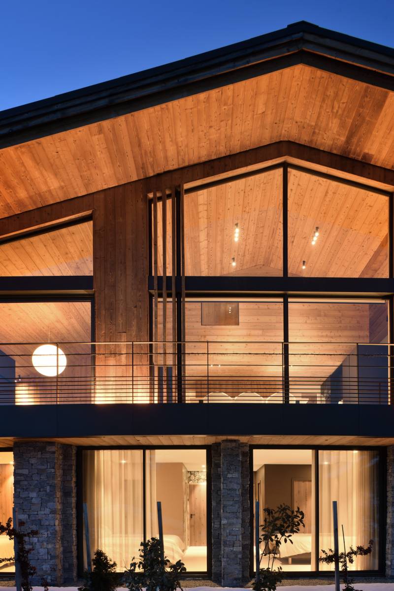 Le chalet se distingue par ses immenses ouvertures et ses hautes baies vitrées offrant une vue spectaculaire sur les montagnes enneigées. La lumière naturelle inonde chaque espace, renforcée par un travail précis d’éclairage intérieur et extérieur : projecteurs et spots mettent en valeur les lignes architecturales et les textures des matériaux.