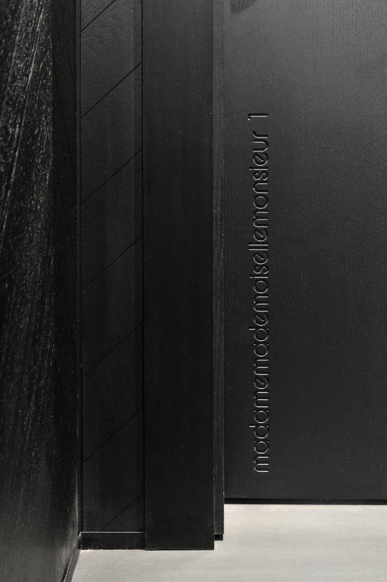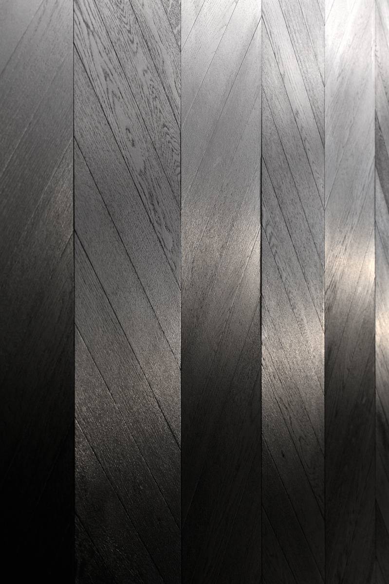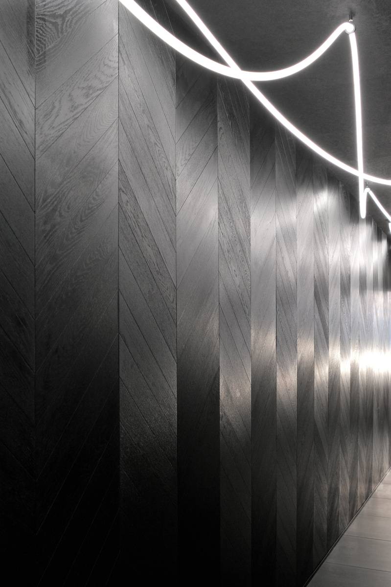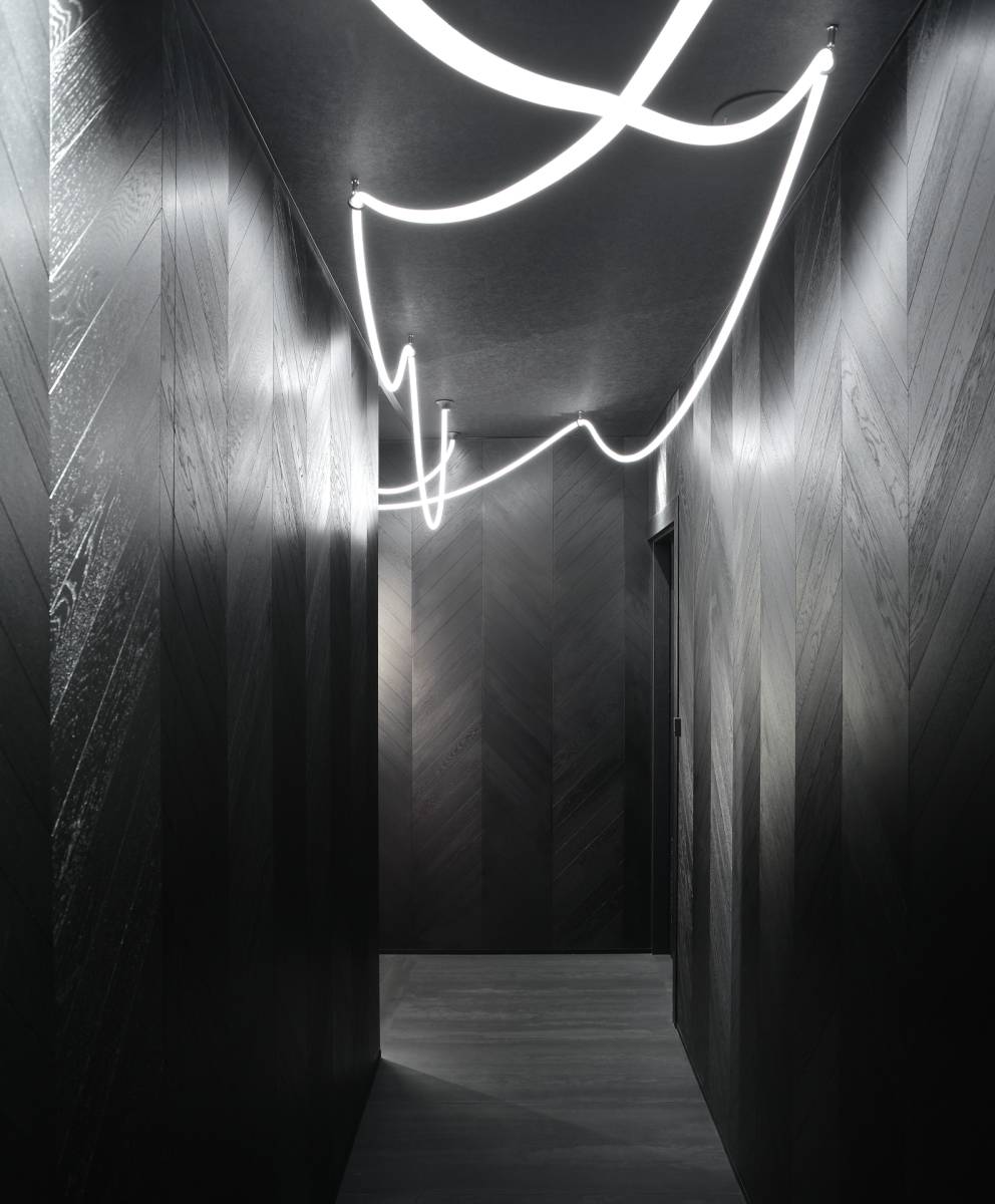 Dès l’entrée, un espace commun intrigue et accueille. Les murs, habillés de chevrons en bois noir, captent le regard tandis que des fils de lumière élégants tracent un chemin lumineux jusqu’à chaque appartement.