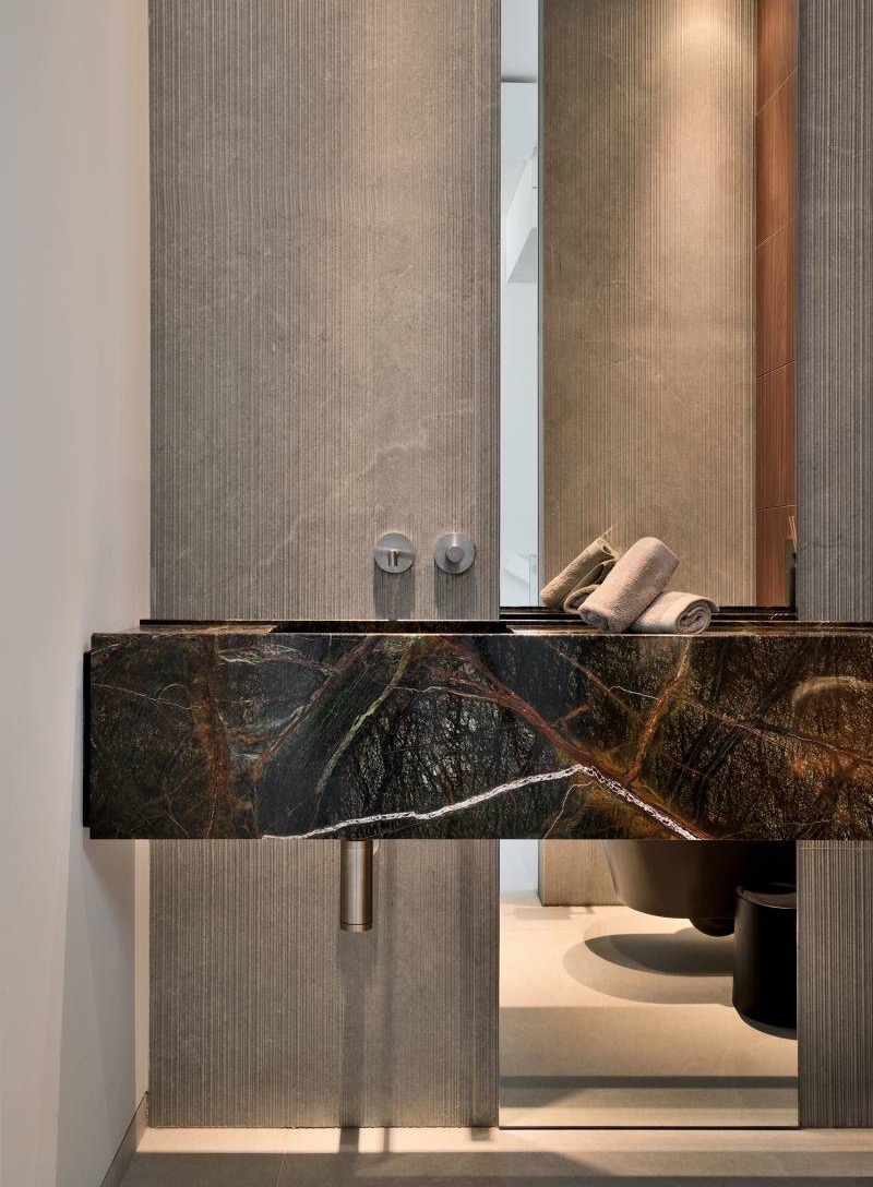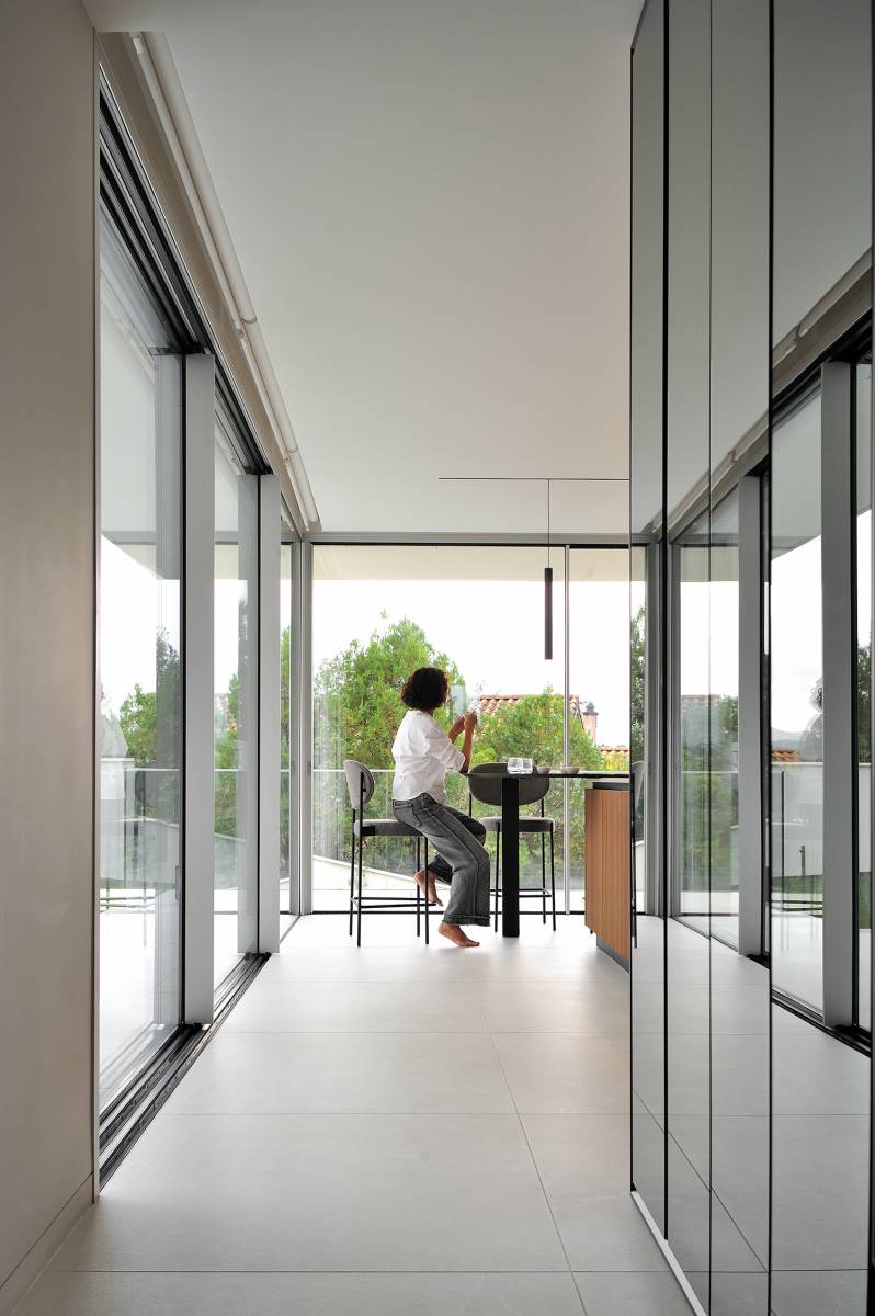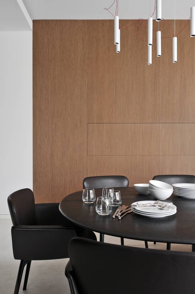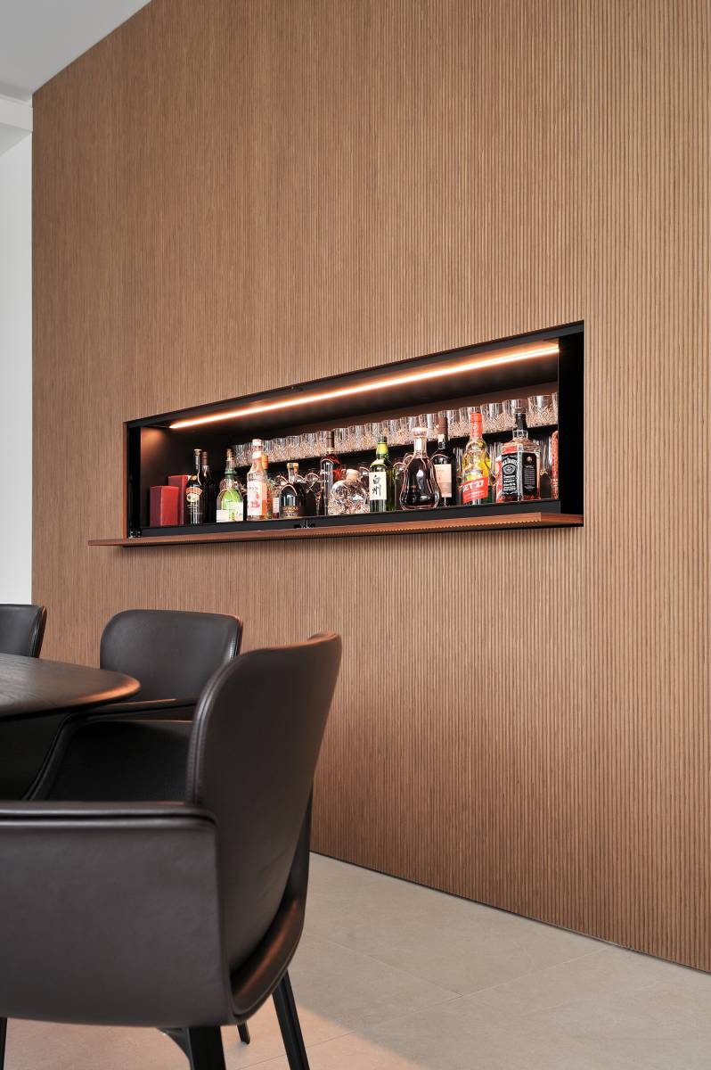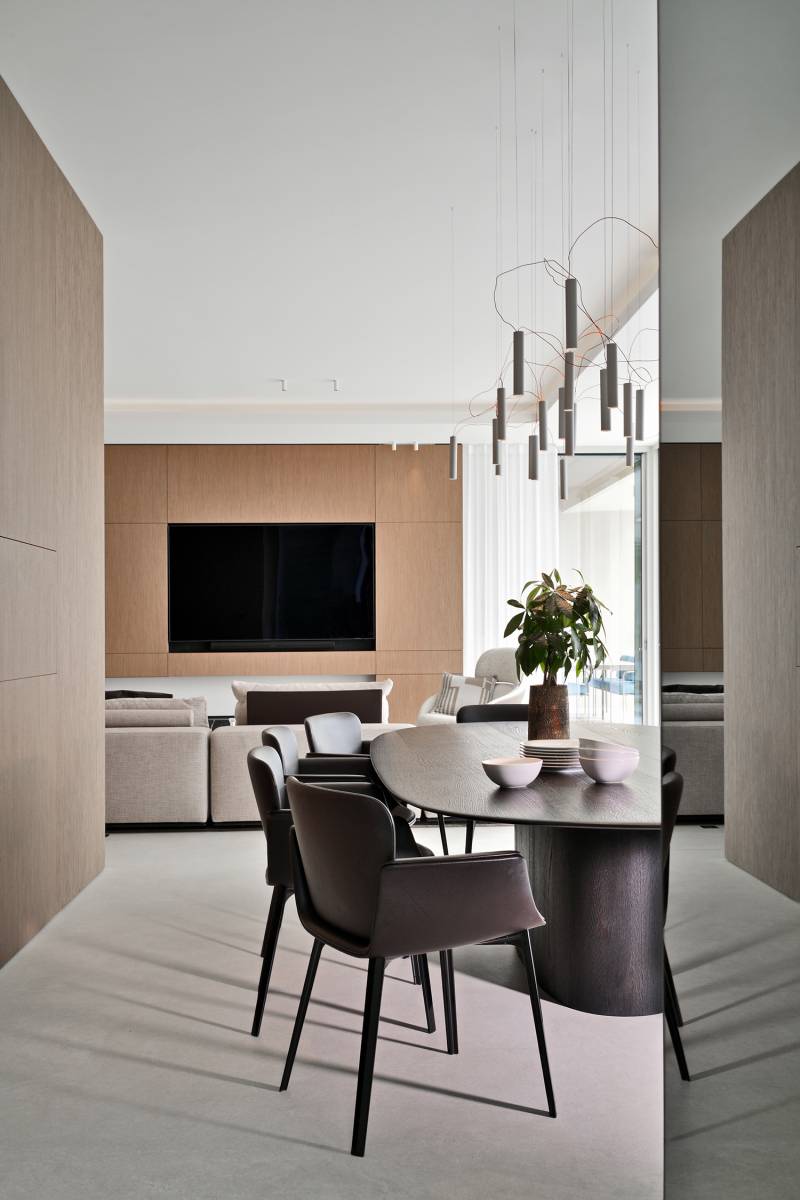 Le choix du mobilier, pensé pour allier confort et modularité, s’intègre parfaitement dans des volumes épurés. Les rangements astucieusement dissimulés optimisent l’espace et contribuent à maintenir un intérieur ordonné et fluide. Les éléments techniques, quant à eux, sont intégrés de manière subtile, préservant l’esthétique sans compromettre la fonctionnalité.