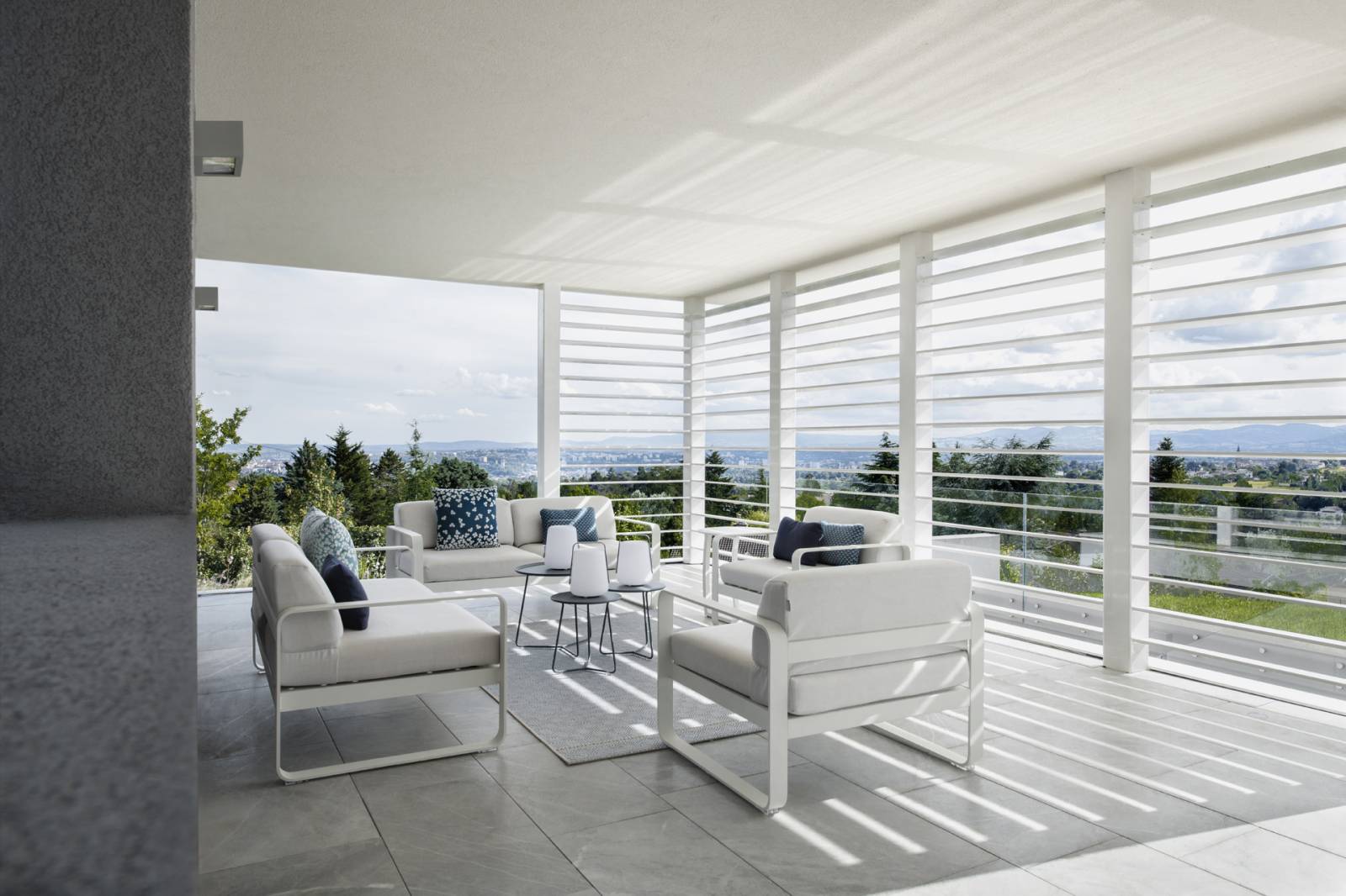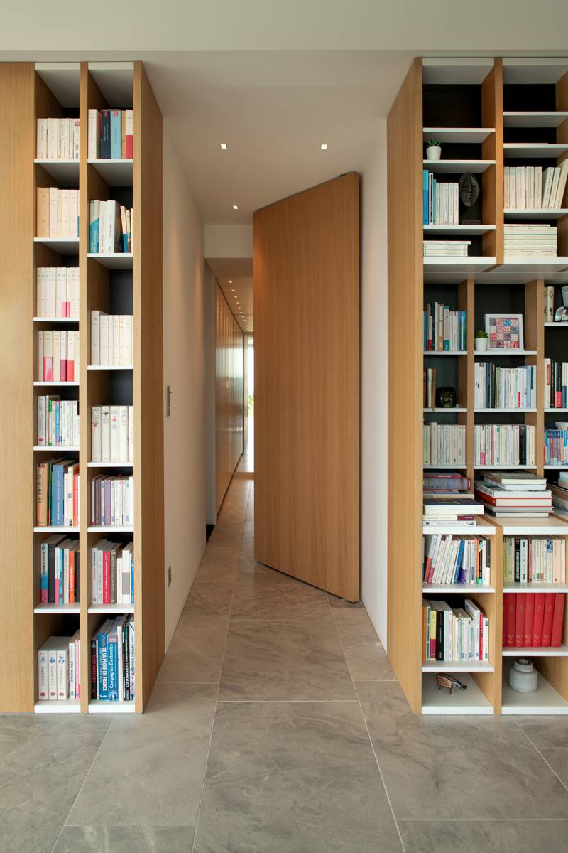 Cette maison contemporaine, au design singulier, est située sur les hauteurs de l'Ouest Lyonnais. Austère depuis la rue, elle s'ouvre petit à petit au visiteur, le menant à la contemplation. Le jeu déstructuré des voiles béton articule les fonctions et les besoins. Chacun revêt un sens pratique, technique et poétique. L'architecture n'est pas guidée par le soucis esthétique, mais découle des nécessités fonctionnelles. Dès lors, le jeu d'emboitements crée une grande variété d'espaces dans leur volumétrie et dans leur rapport à la lumière.