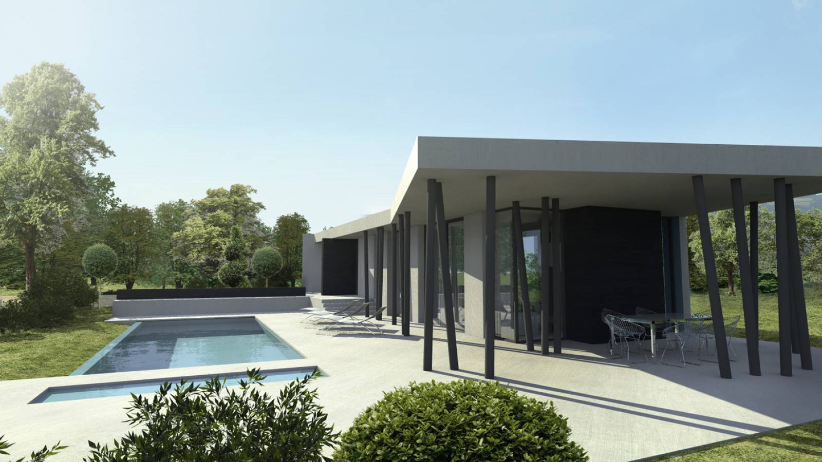 Située dans l'Ouest Lyonnais, la "maison y" est construite sur un terrain en léger dévers. Entre forêt et jetée, elle possède une longue et profonde casquette blanche soulignant les « parties jour » face aux bassins. L'ombre portée se joue des poteaux et des contrastes des matériaux. Quant à l’entrée, elle propose deux univers : la partie jour, largement ouverte au sud, et la partie nuit, protectrice, avec ses ouvertures réduites et son aboutissement à la suite parentale. Elle se jette en porte-à-faux dans la plaine. Labélisée HQE*, cette maison est un manifeste pour l'intégration architecturale contemporaine à coût et énergies réduits.