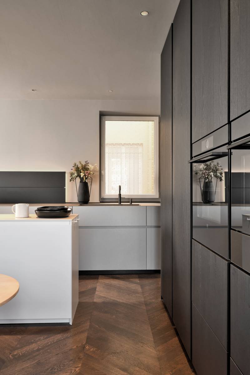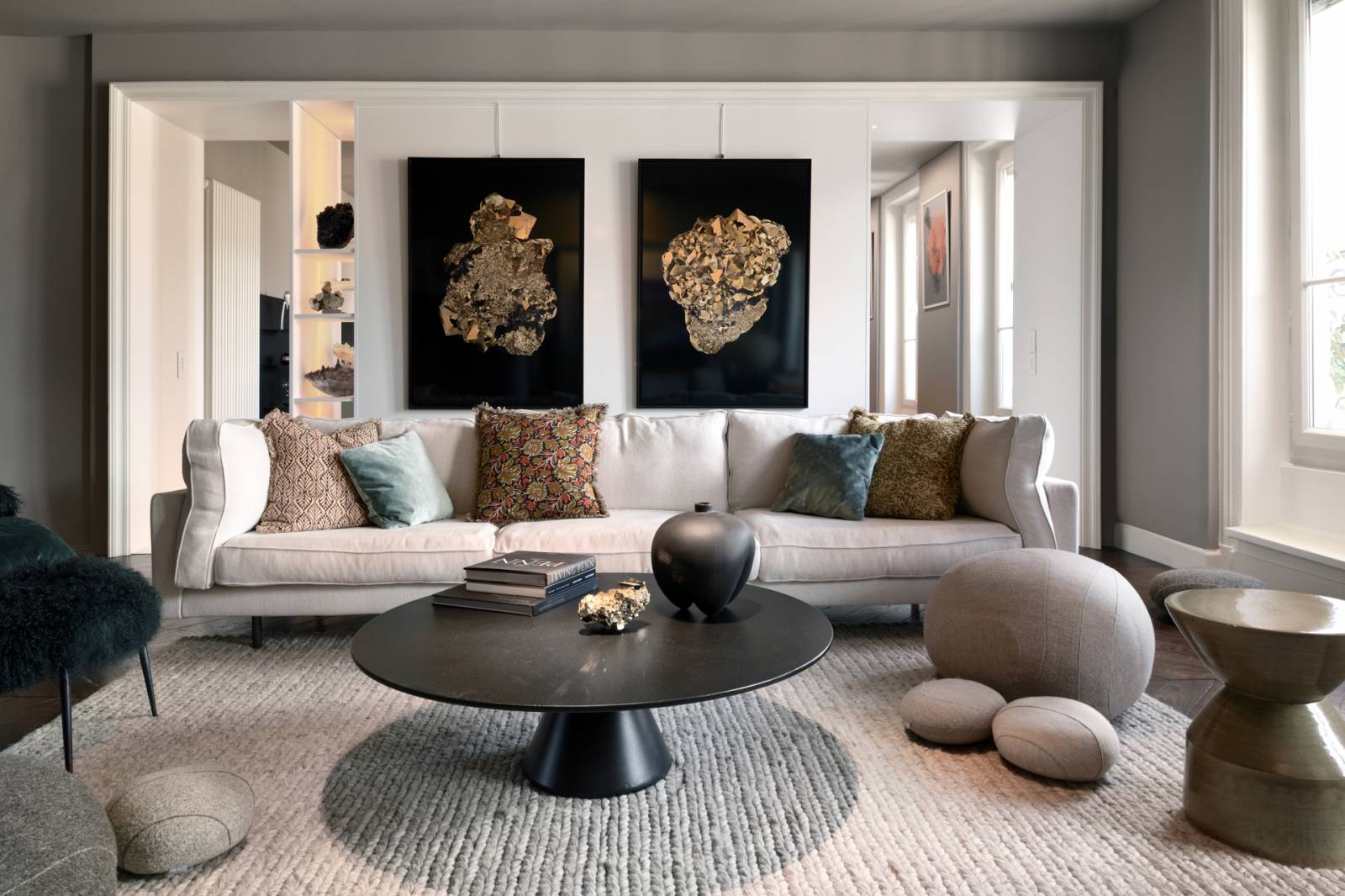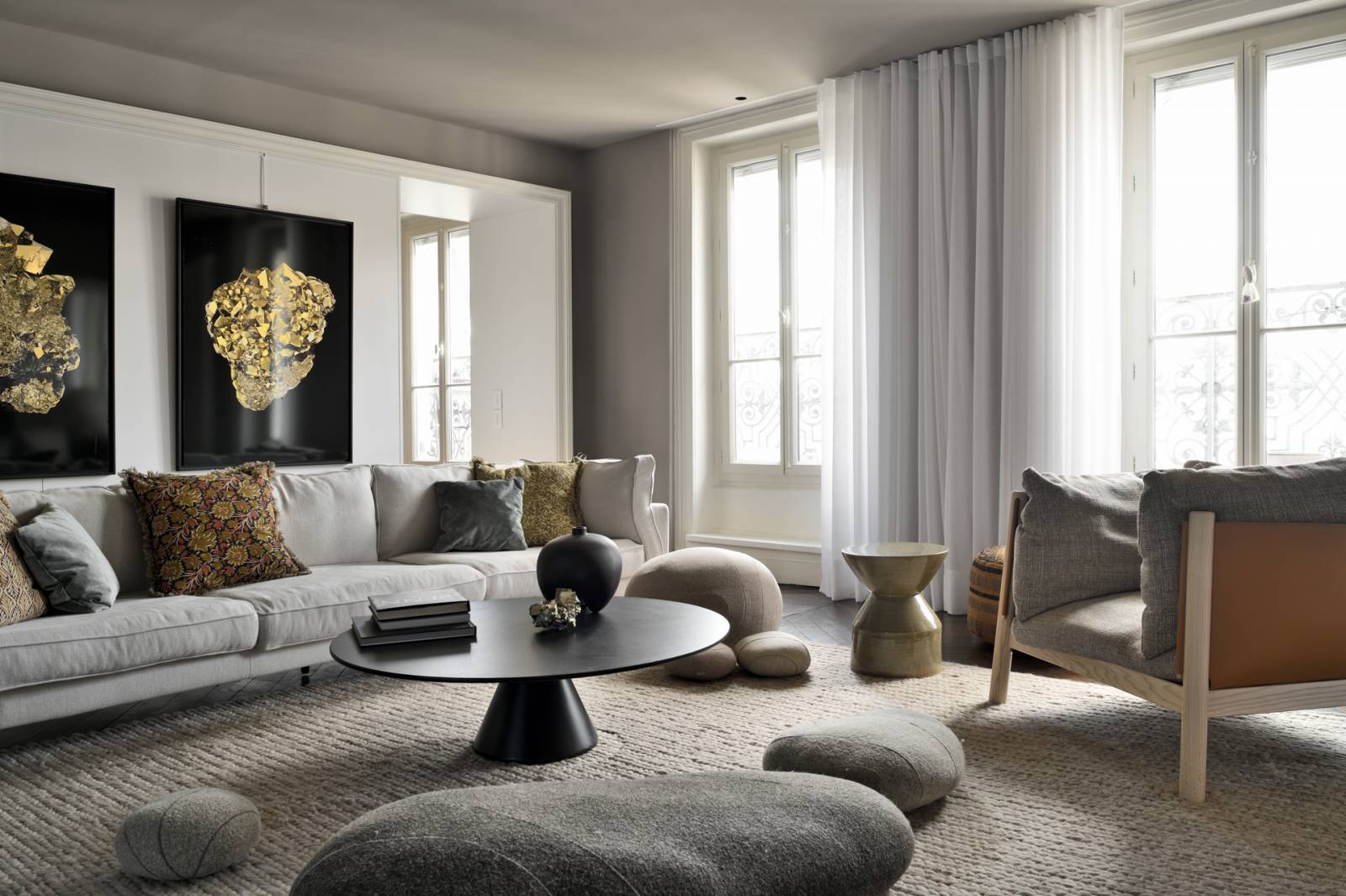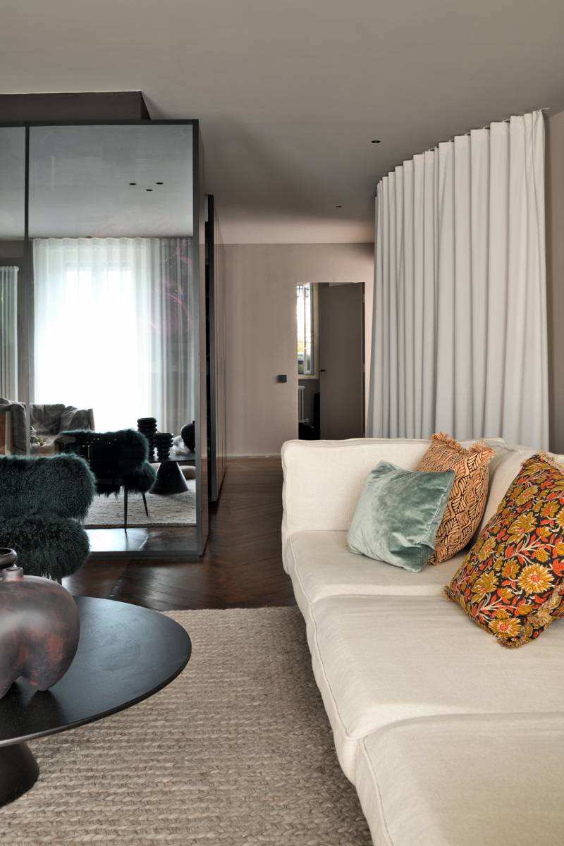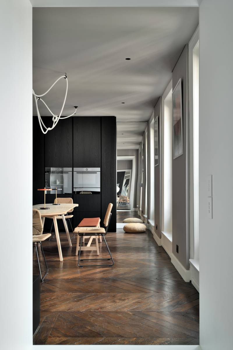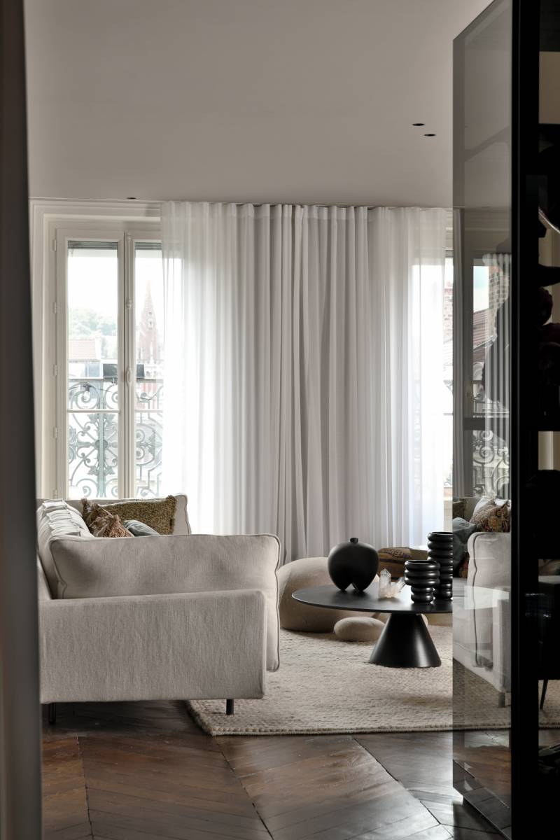 Cet architecture se distingue donc par la conservation de certains éléments architecturaux d'époque, tels que les moulures, les cheminées en marbre et les parquets en bois massif. Ces détails authentiques créent un contraste élégant avec un agencement moderne, utilisant des formes plus pures et tendus.