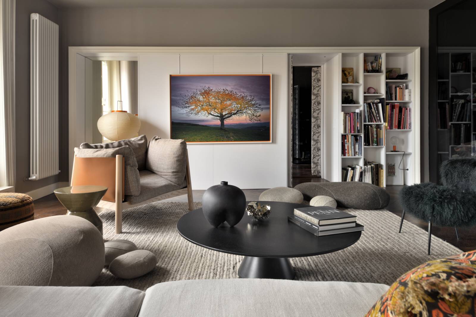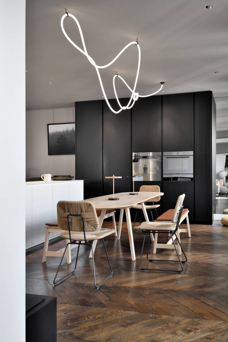 L'éclairage soigneusement étudié met en valeur chaque espace, jouant avec les volumes pour créer des ambiances variées et sophistiquées. Les découpes précises des volumes architecturaux apportent une dynamique visuelle et une fluidité remarquable à l'ensemble de l'appartement.