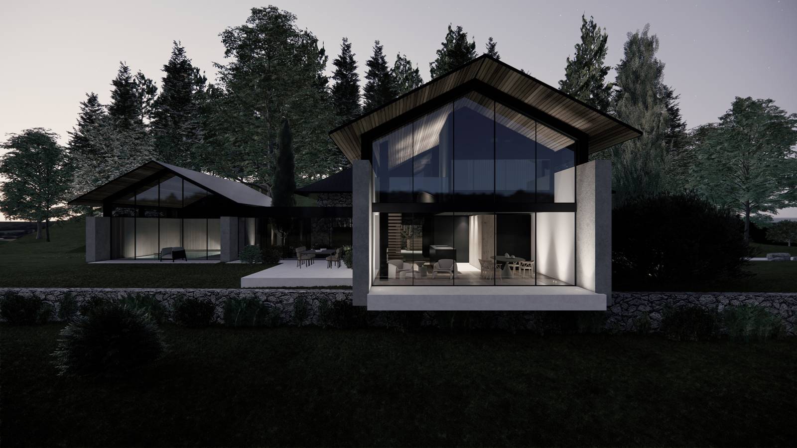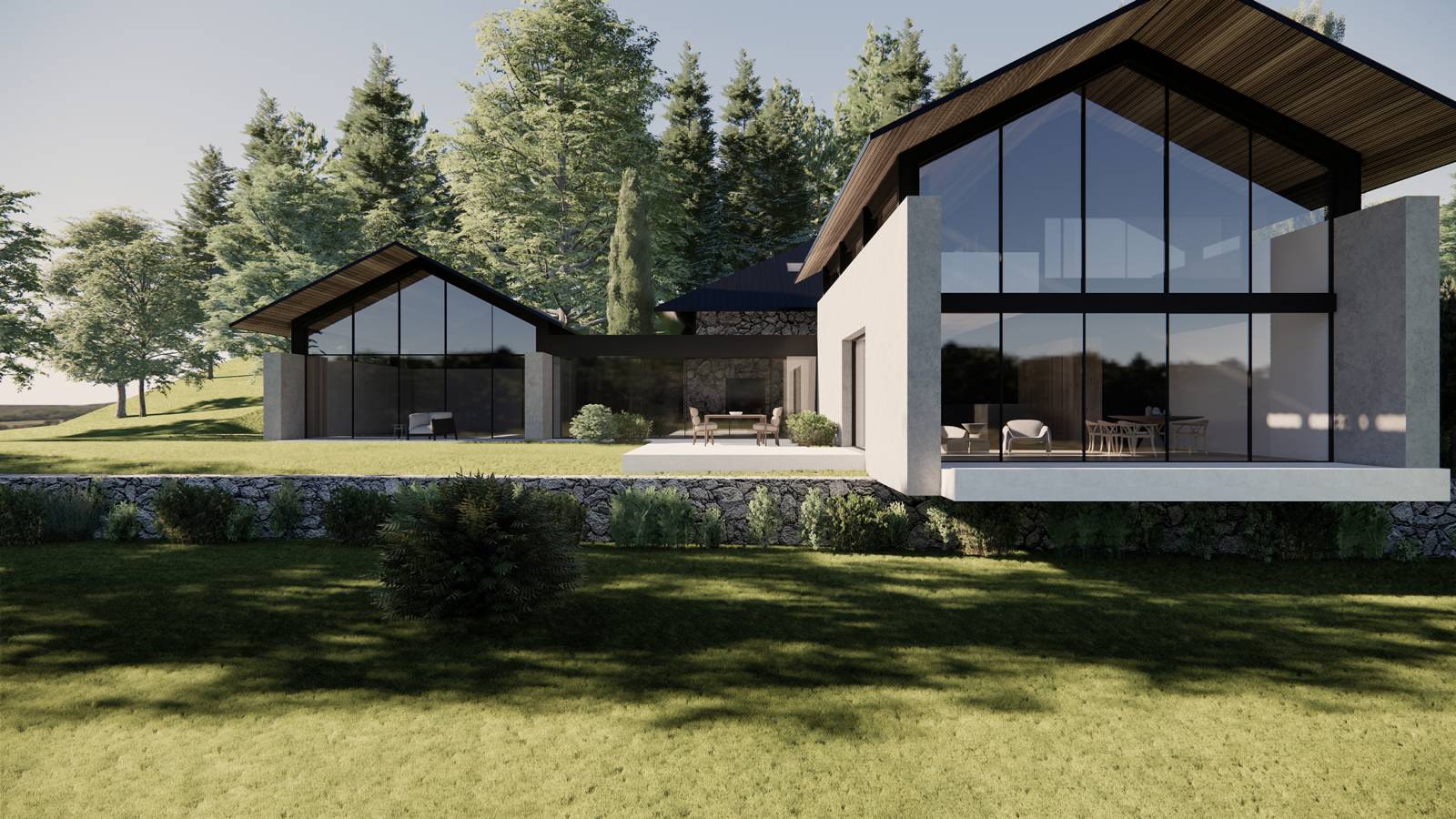 La surface du bâtiment existant a été étendu par la construction de deux bâtiments. Ces deux volumes, à l’allure plus contemporaine, tendent à réinterpréter les codes de l’architecture traditionnelle. Les ouvertures ne sont plus des percements, mais simplement le vide entre les murs et la toiture. Nous avons souhaité apporter le maximum de sobriété face à la superbe du site. Malgré les imposants murs rappelant la rudesse du monde forestier, l’ensemble est conçu pour sembler simple et léger.