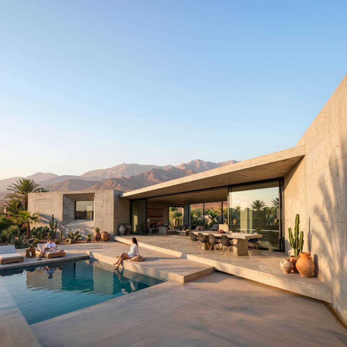 A proximité de Marrakech, un petit village fait face à l'Atlas. Au milieu d'un chemin chaotique, dans un mur anonyme : un passage. Derrière celui-ci, une surprise… Fidèle à l'intemporalité du site, elle est là, dans une légère lévitation qui confère à l'humilité. Elle présente, face au désert, deux volumes percés d'ouvertures ciselées. Ce sont les suites. Celles-ci sont liées par deux dalles de béton entre lesquelles se construit l'espace de vie. Ce dernier donne sur deux terrasses en quinconce. Enfin, les suites de dalles intègrent une longue piscine portée à l'aridité du désert. La "villa n" est construite comme un mirage…